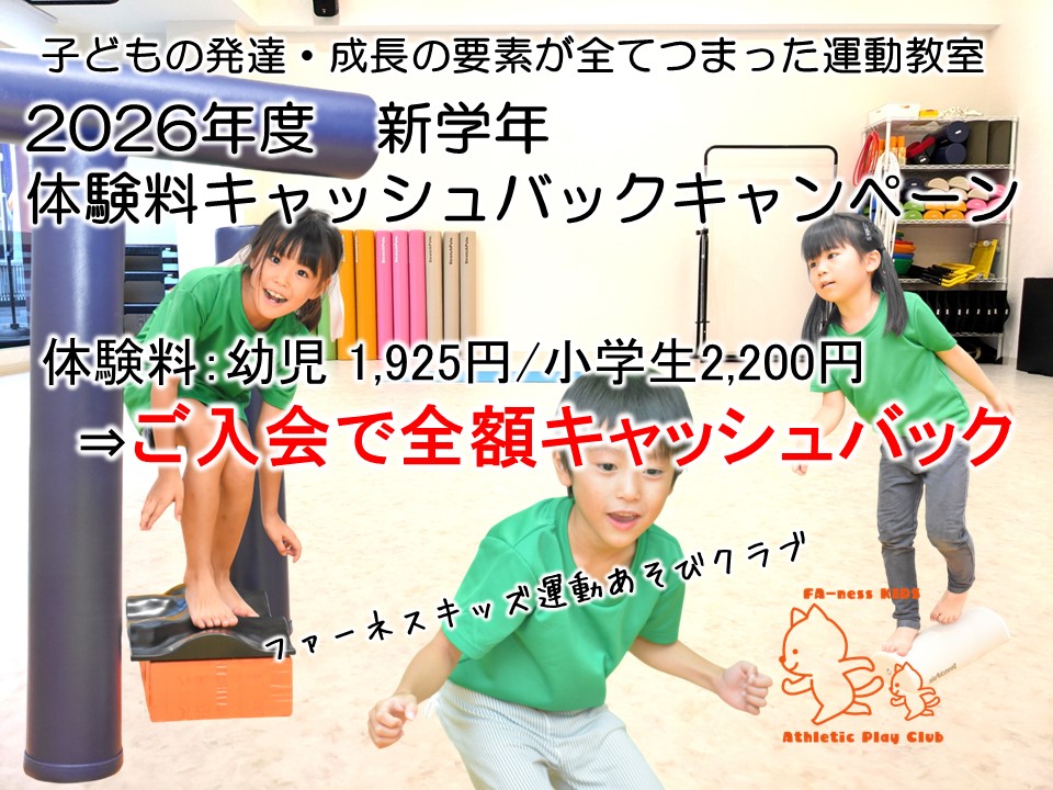 - 2026年度 新学年 体験料キャッシュバックキャンペーンお得に体験ができるキャンペーン 特定のスポーツや種目を行うのではなく、子どもたちの発達・成長に必要な運動を遊び… 続きを読む: 2026年度 新学年 体験料キャッシュバックキャンペーン
